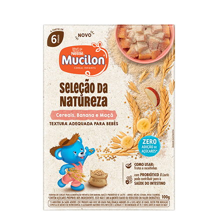 Mucilon® Banana, Maçã e Quinoa faz parte da linha Seleção da Natureza e é um cereal infantil zero adição de açúcares*, composto por frutas naturais desidratadas e um mix exclusivo de arroz, milho, cevada, aveia e a quinoa, conhecida como“super grão”. É um complemento alimentar para bebês a partir do 6º mês e uma ótima opção para lanches intermediários. Com Probiótico B.lactis pode contribuir para a saúde do intestino e Rico em nutrientes que contribuem para a Imunidade² e Desenvolvimento Cerebral³/ Nossos grãos são cuidadosamente selecionados de fazendas ao redor do mundo e passam por diversos testes de qualidade. Garantindo Nutrição de qualidade do grão à cumbuquinha. Os cereais estão na base da pirâmide alimentar. Quando você oferece Mucilon® para bebês a partir de 6 meses, está dando uma importante fonte de energia e nutrientes que contribuem para o seu crescimento e desenvolvimento.